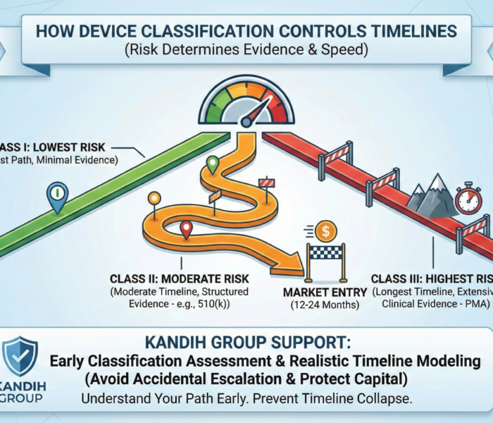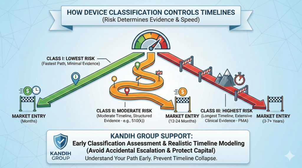 Published by admin on February 17, 2026 Straight answer: device classification controls how much evidence you must generate—and that controls how fast (or slow) you reach market. If you don’t understand your classification early, your timeline is not a plan. It’s a guess. Under the framework of the U.S. Food and Drug Administration, medical devices are placed into three risk-based classes: Class I, Class II, and Class III. The higher the risk, the heavier the evidence burden—and the longer the timeline.