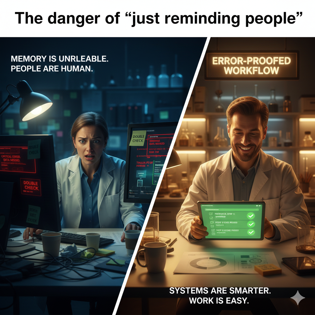 In real life—busy labs, fast-moving studies, tight timelines—people don’t fail because they don’t care. They fail because systems are built to depend on memory, and memory is unreliable under pressure.