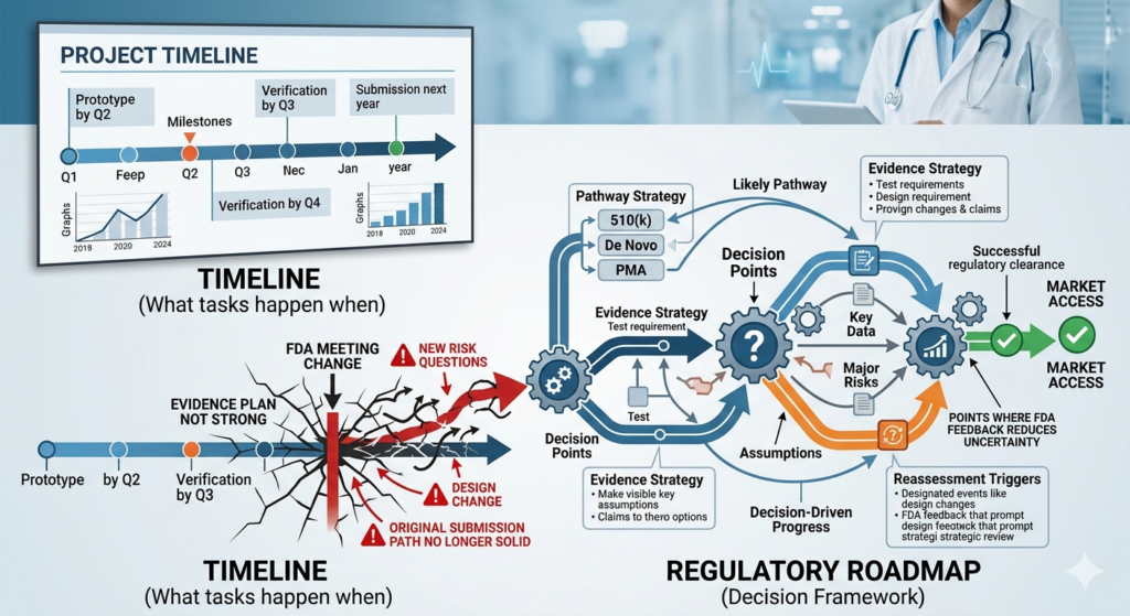 Competitor content in the sector also tends to position roadmap work as cross-functional and commercially important, not just technical. NAMSA, for example, describes startup roadmap planning in terms of parallel development opportunities, reduced time, reduced cost, and reduced risk.