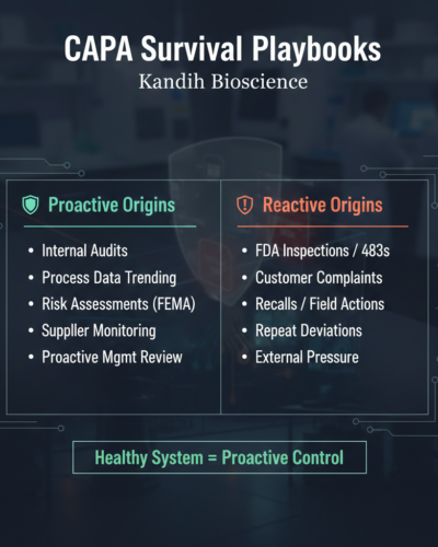 This is not abstract quality theory. It is inspection reality. FDA inspectors can quickly tell whether a CAPA system is driven by risk intelligence or compliance anxiety. Where your CAPAs originate—complaints, deviations, suppliers, audits, or FDA findings themselves—tells a clear story about whether the organization is in control or simply responding after the fact.